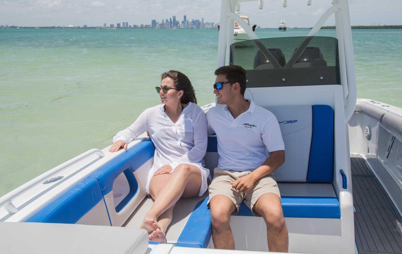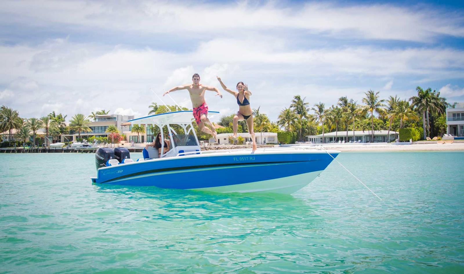 A spacious cuddy cabin means shelter from the hot Florida sun and additional storage space. Its unique center-console design is compact enough to allow free movement around the deck, while providing easy access to fish boxes and rod holders. Make it your own by choosing from a wide array of custom graphics, t-tops, lighting and sound system options.